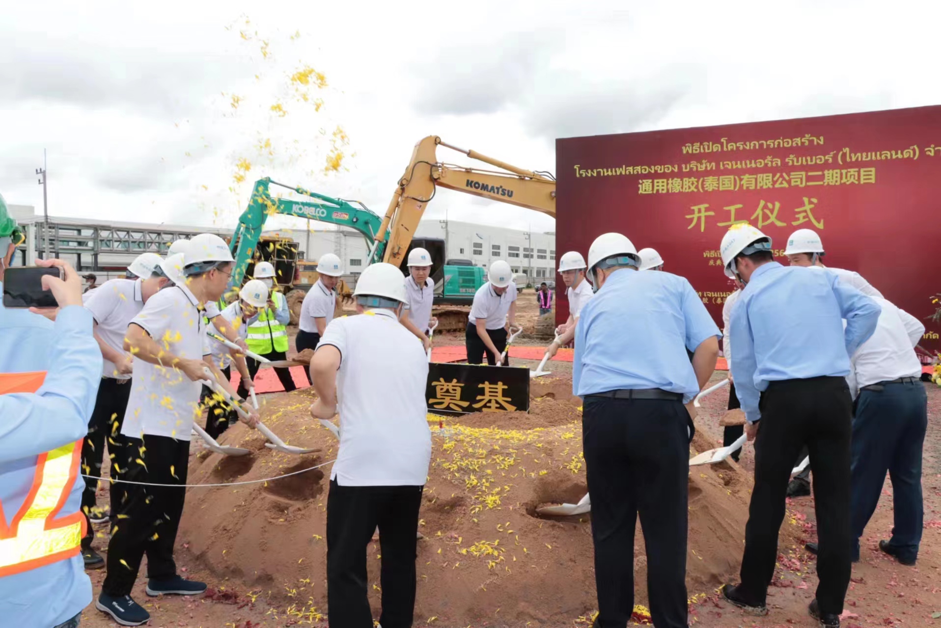 隨著各位領(lǐng)導(dǎo)共同完成“第一鏟土”,現(xiàn)場禮花滿天、禮炮齊鳴,奠基儀式圓滿落成,標(biāo)志著通用橡膠泰國公司二期項目正式起航。